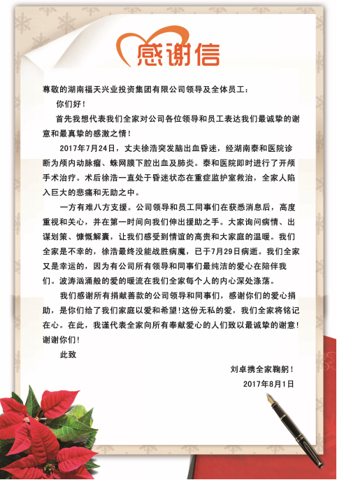 徐浩是我公司采购部员工,自2016年9月18日入职以来,工作兢兢业业,任劳任怨。今年7月24日,突发脑出血昏迷,经湖南泰和医院诊断为颅内动脉瘤、蛛网膜下腔出血及肺炎。在7月28日的手术中,年仅36岁的徐浩永远地离开了登录入口。这突如其来的噩耗让他的家人、朋友、同事悲痛万分,对徐浩并不富裕的小家庭而言更是沉重的打击。
