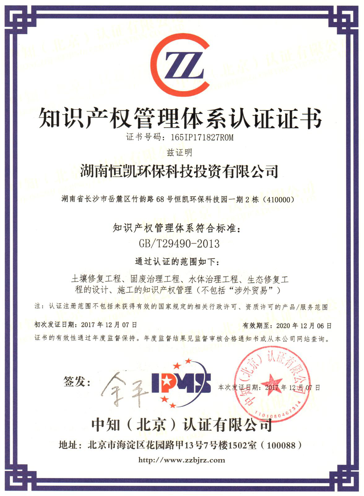 11月29日,恒凯环保举行了知识产权管理体系初次认证二阶段审核,经专家认真审核与严格把关,公司顺利通过了中知(北京)认证有限公司认证,并于12月7日荣获GB/T29490-2013《知识产权管理体系认证证书》,这表明公司在知识产权领域已经形成了一套完整的管理体系。