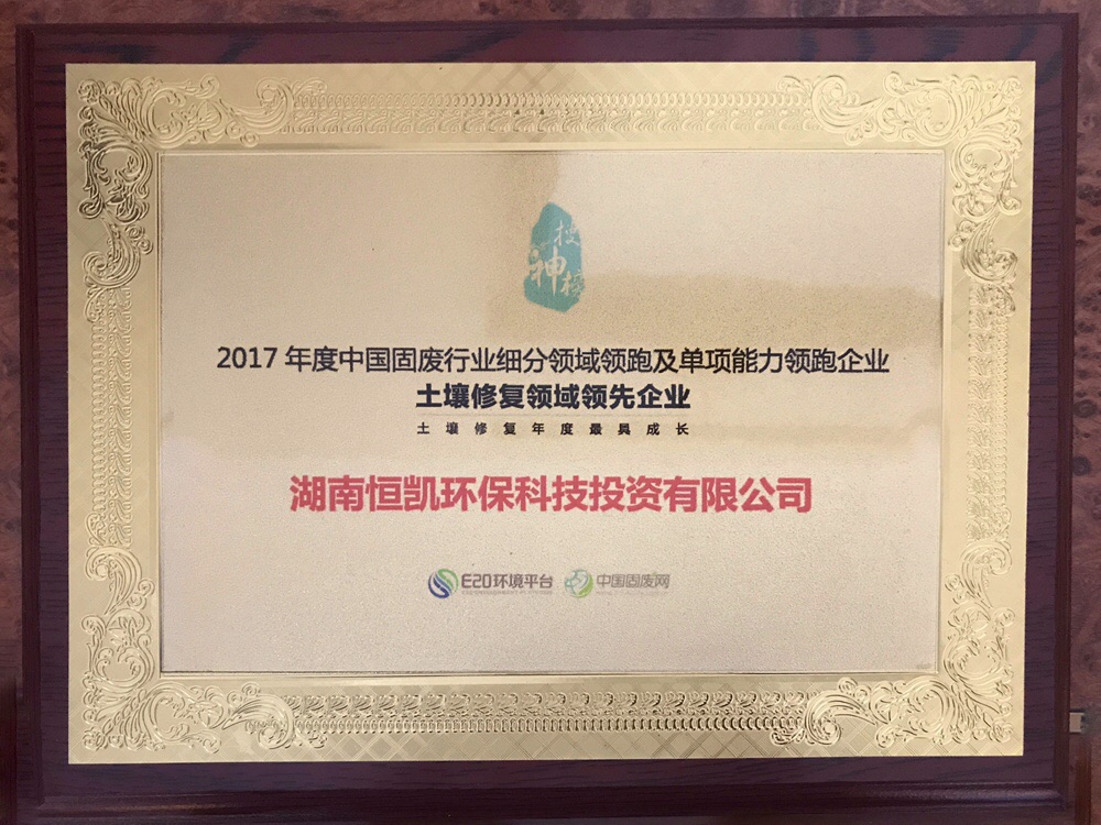 恒凯环保在此次固废行业企业评选中荣获“2017年度中国固废行业细分领域领跑及单向能力领导企业 土壤修复领域领先企业 土壤修复年度最具成长”奖。公司将继续秉承着做大做强的信念,直面当下污染场地修复领域新时代、新格局的需求,对行业发展存在的挑战迎难而上,抓住行业发展的机遇。公司将在重金属污染场地修复、污泥处理处置、有机污染场地修复、黑臭水体修复、农田污染修复、生物除臭等技术领域展开研究,形成一系列核心技术,实现成为国际一流、国内领先的环保企业的战略目标。